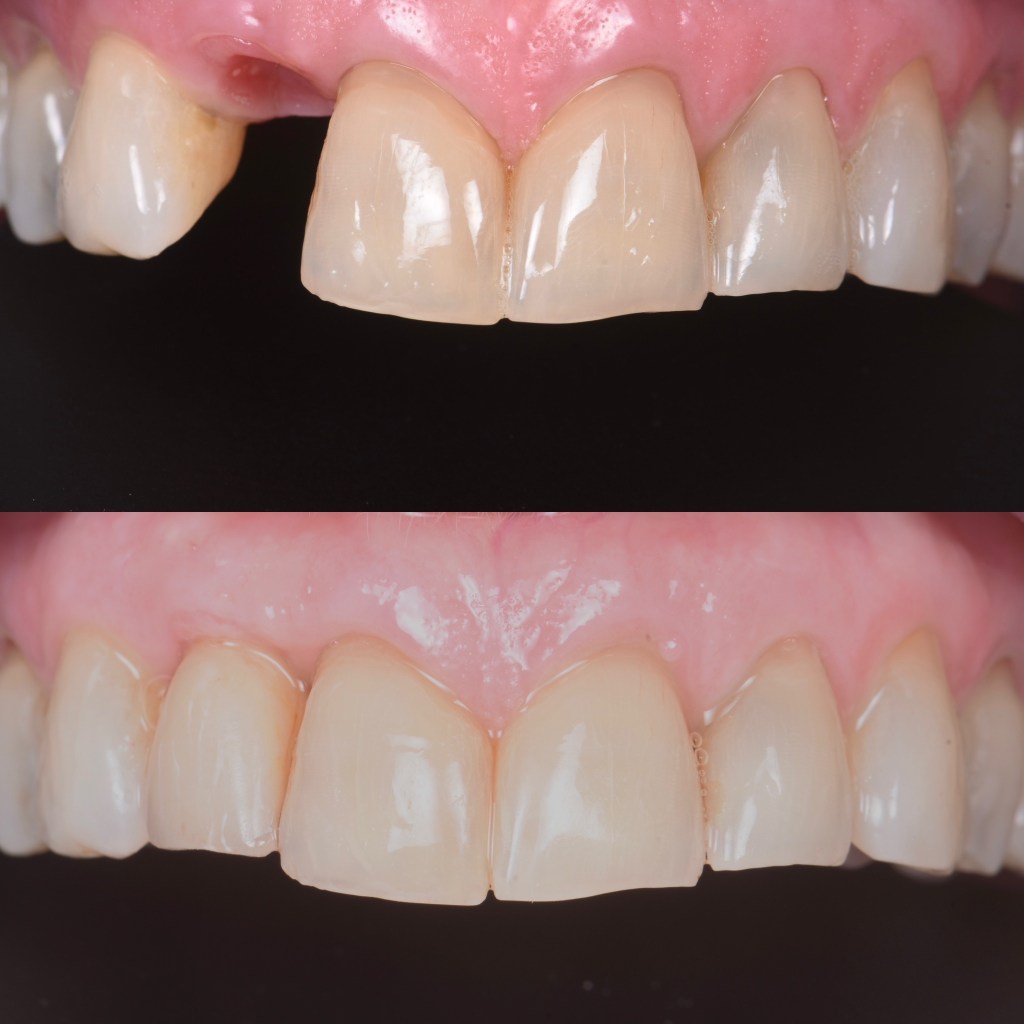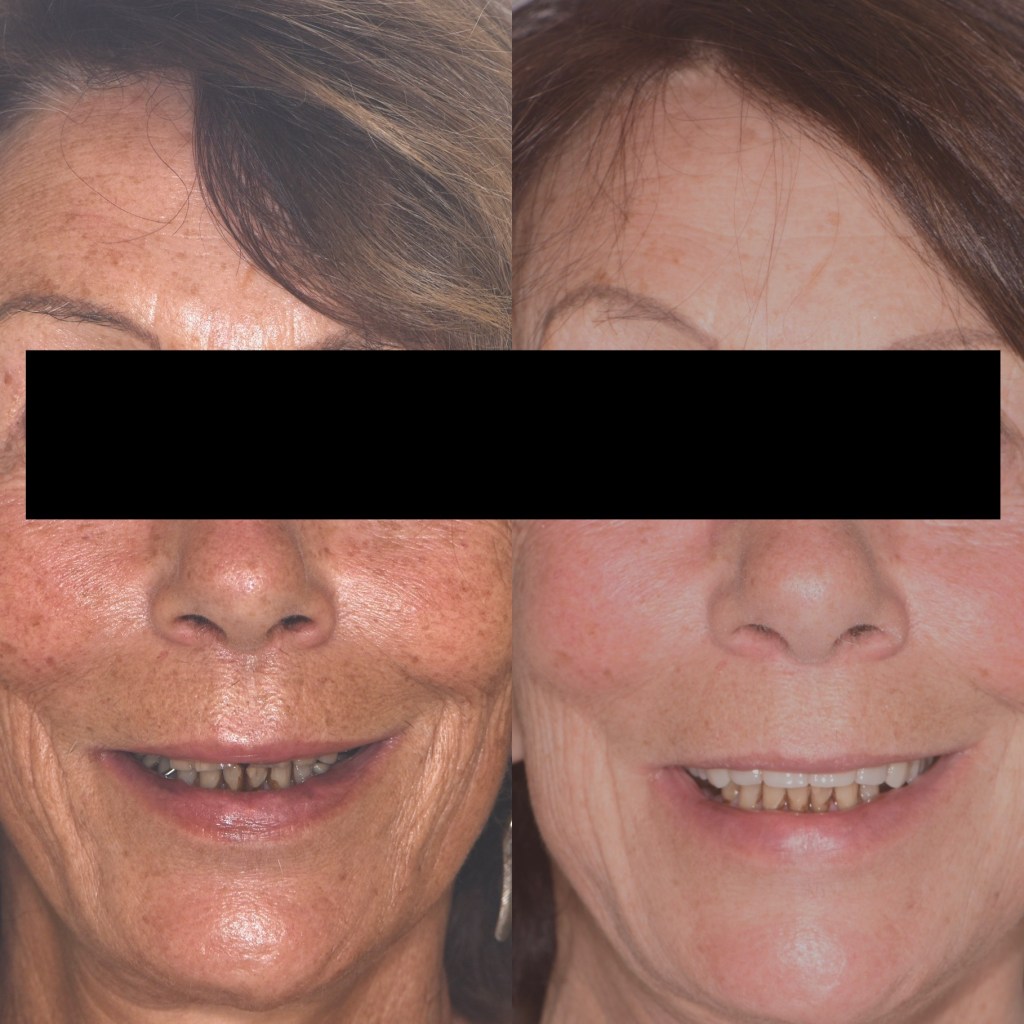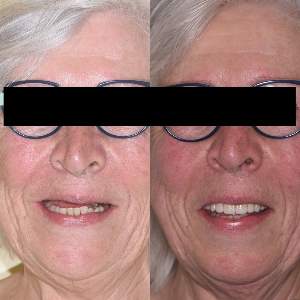 Ici, cette patiente présentait une absence totale de dents du haut compensé par un appareil dentaire complet. Après une planification rigoureuse impliquant des radiographies 3D, scanner, photographies, nous avons pu prévoir sur une matinée la pose de 6 implants à travers un guide chirurgical, ainsi que la mise en place d’un bridge provisoire complet. La patiente est donc repartie avec des dents fixes. 3 mois après, le bridge définitif a pu être réalisée en céramique polycristalline (Zircone)