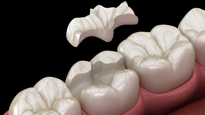 Lorsqu’une carie se forme, nous pouvons la traiter à l’aide d’une restauration type composite. Autrefois nous utilisions un amalgame (plombage) de couleur métallique, qui n’est aujourd’hui plus d’actualité. Quand la carie ou cavité est de petite étendue, un composite fait à la main de manière directe est la solution de choix. Seulement, lorsque la cavité ou carie est de grande taille, il faut un matériau collé « en un seul bloc », de manière à ce qu’il n’y ai pas de variations dimensionnelles dans le temps : C’est ce qu’on appelle un onlay. Un overlay est la même technique mais lorsque celui-ci remplace toute la surface de la dent. Ces techniques sont beaucoup moins délabrante pour l’émail que des couronnes traditionnelles.