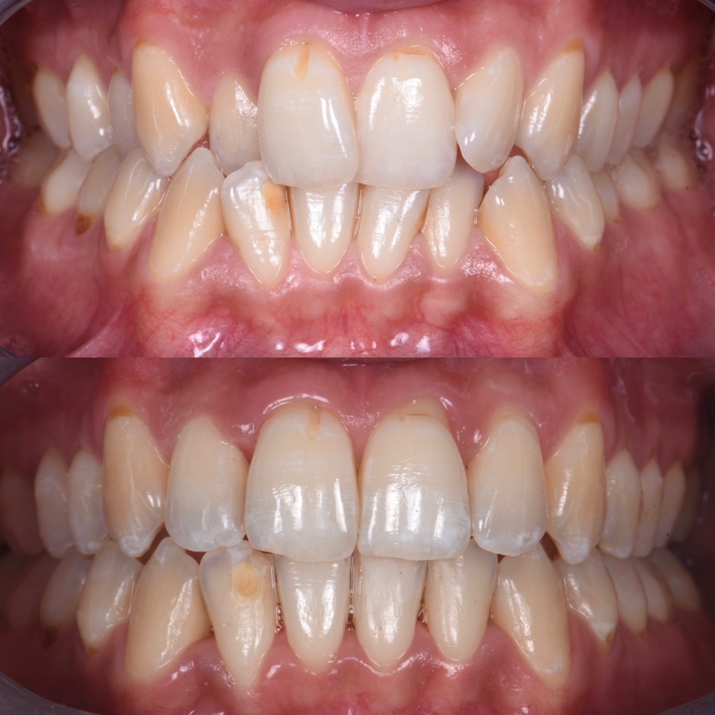 Ici, nous pouvons voir un « avant/après » ayant nécessité 9 mois de traitement a l’aide de gouttières transparentes.